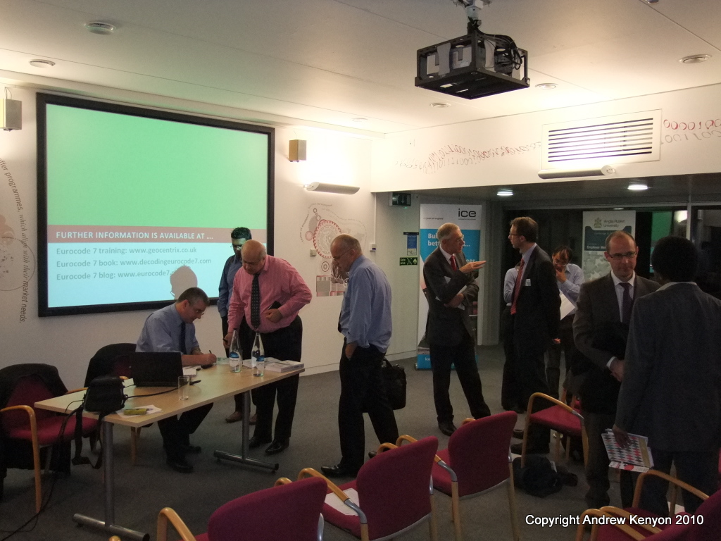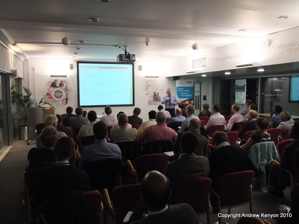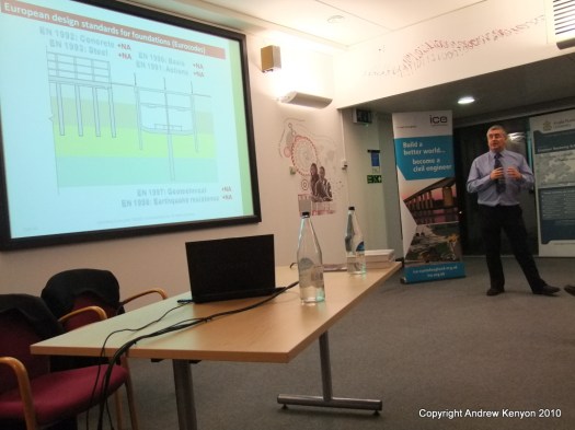 The presentation slides from the evening are now available from Dr Bond’s Eurocode 7 blog page via the www.eurocode7.com link and directly here http://geocentrix.typepad.com/files/decoding-eurocodes-2-and-7.pdf