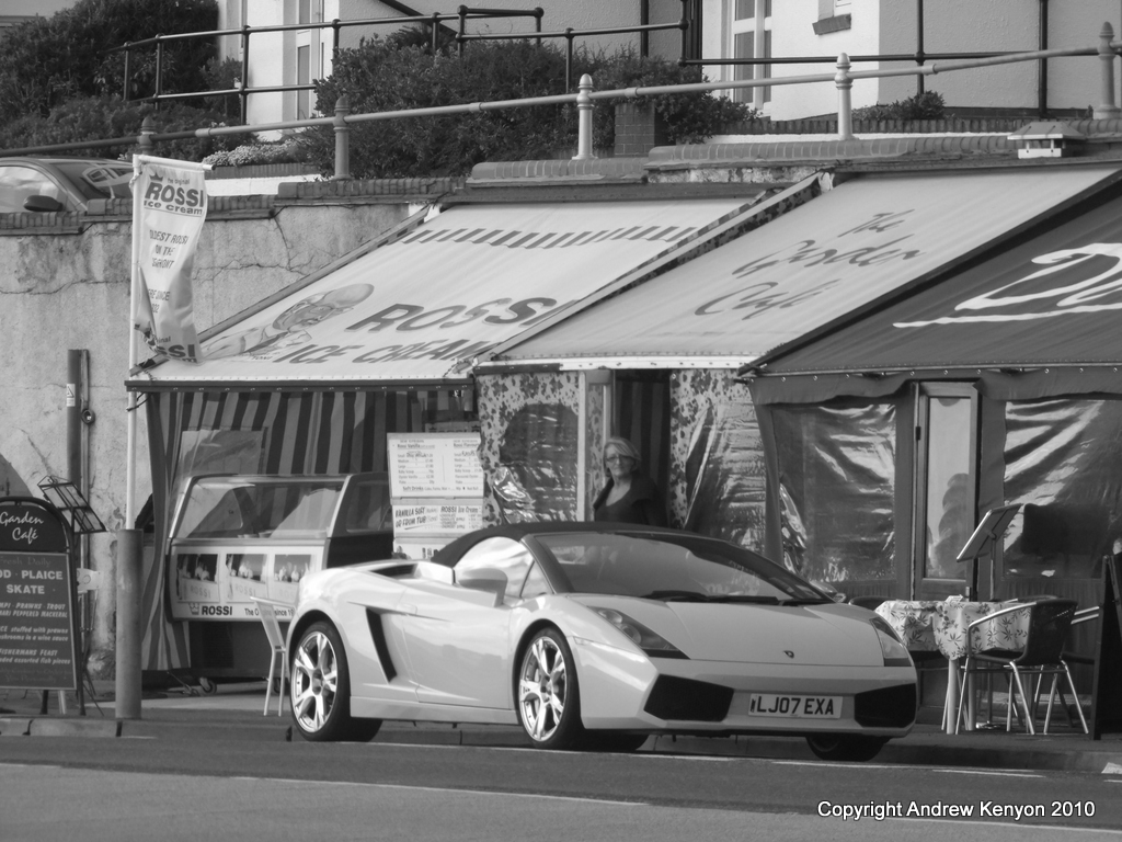 Halfway along the seafront are some highly recommended restaurants in the arches under the cliffs [map]. A soft top Lamborgini Guiado parked outside was drawing a fair amount of attention!