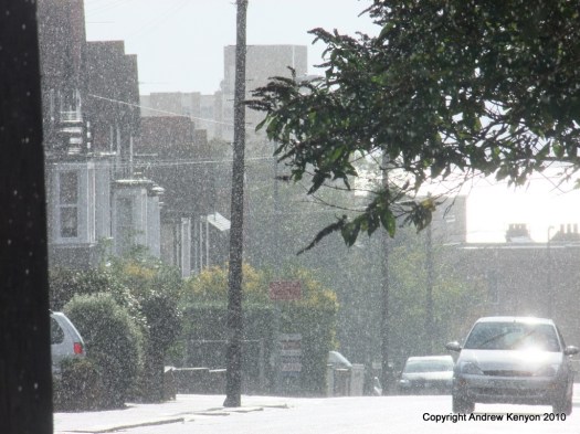 Rain was heading in by now so it was time to head back home which was only a twenty minute stroll from the seafront. Halfway there the heavens opened which necessitated we sheltereing under a tree for ten minutes or so. This did lead to an interesting photo of the rain in the bright sunshine.