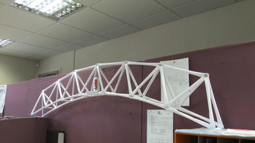 In the afternoon I was less busy than the morning so a proceeded with an activity I had pre-planned to generate a little more interest in my stand. I had brought paper, tape and paper fasteners and I set about constructing a simple truss bridge. my stated aim was to make a bridge long enough to span the corridor to the nail bar girls and then to load test it. It proved to be great fun and generated lots of interest from both students and other exhibitors.