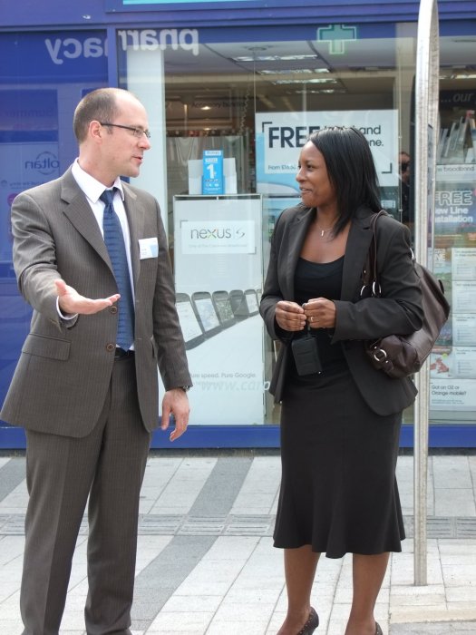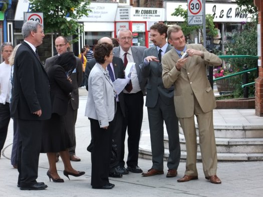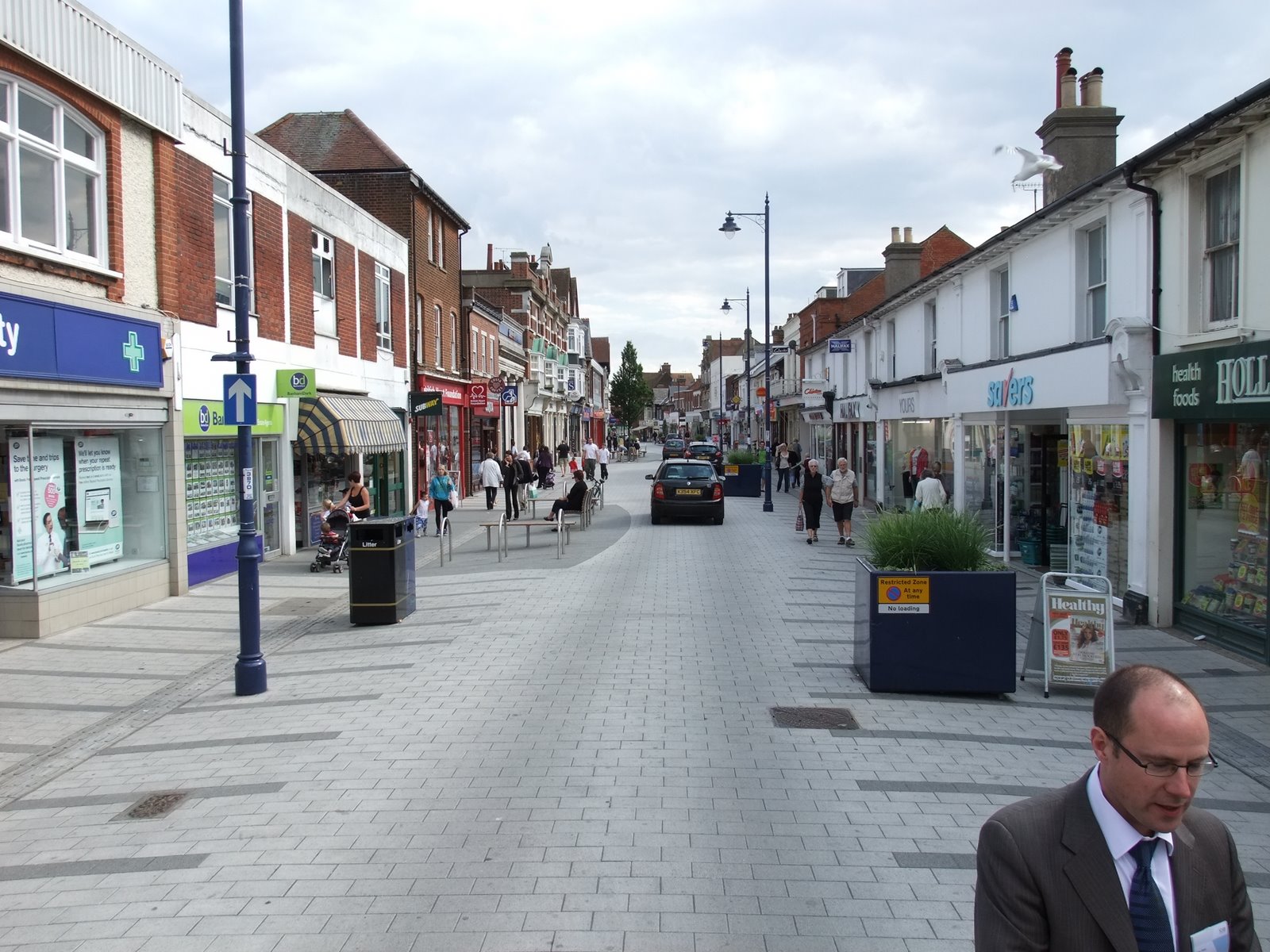 With the schedule falling behind the party then moved on to the last visit of the day to the centre of nearby Felixstowe Town to view the Hamilton Road Shared Space project.  The party were shown around by Luke Barber of Suffolk County Council and were all impressed by what has been achieved to integrate pedestrians and vehicles.  I was particularly impressed by the quality of the works and attention to detail in the block laying.  The President had previously been provided with photographs of the road before the shared space scheme was introduced and all agreed that the transformation was amazing.