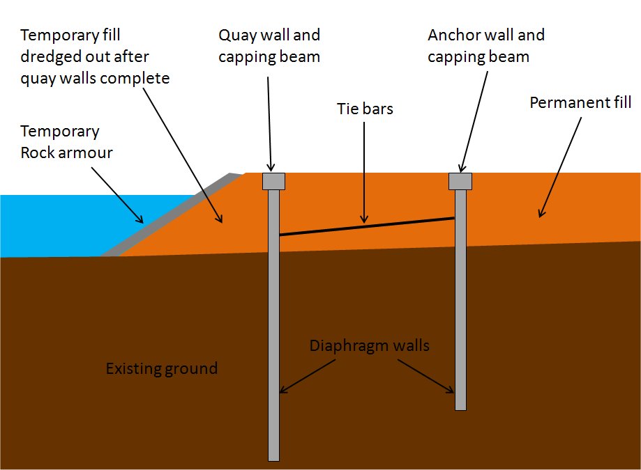 Construction of a quay using diaphragm walling techniques is not new, but has not been used extensively in the UK previously. To construct the quay wall the area first needs to be filled to above water level with material to allow the quay wall to be installed. The fill behind the quay wall then becomes the fill under the quayside areas. The main quay wall is then installed in the same way as would be carried out on any site and a capping beam constructed on top. This wall needs to be anchored back and this is normally done using a second diaphragm wall set back from the first with steel tie bars connecting the two. The anchor wall also has a capping beam constructed on top.