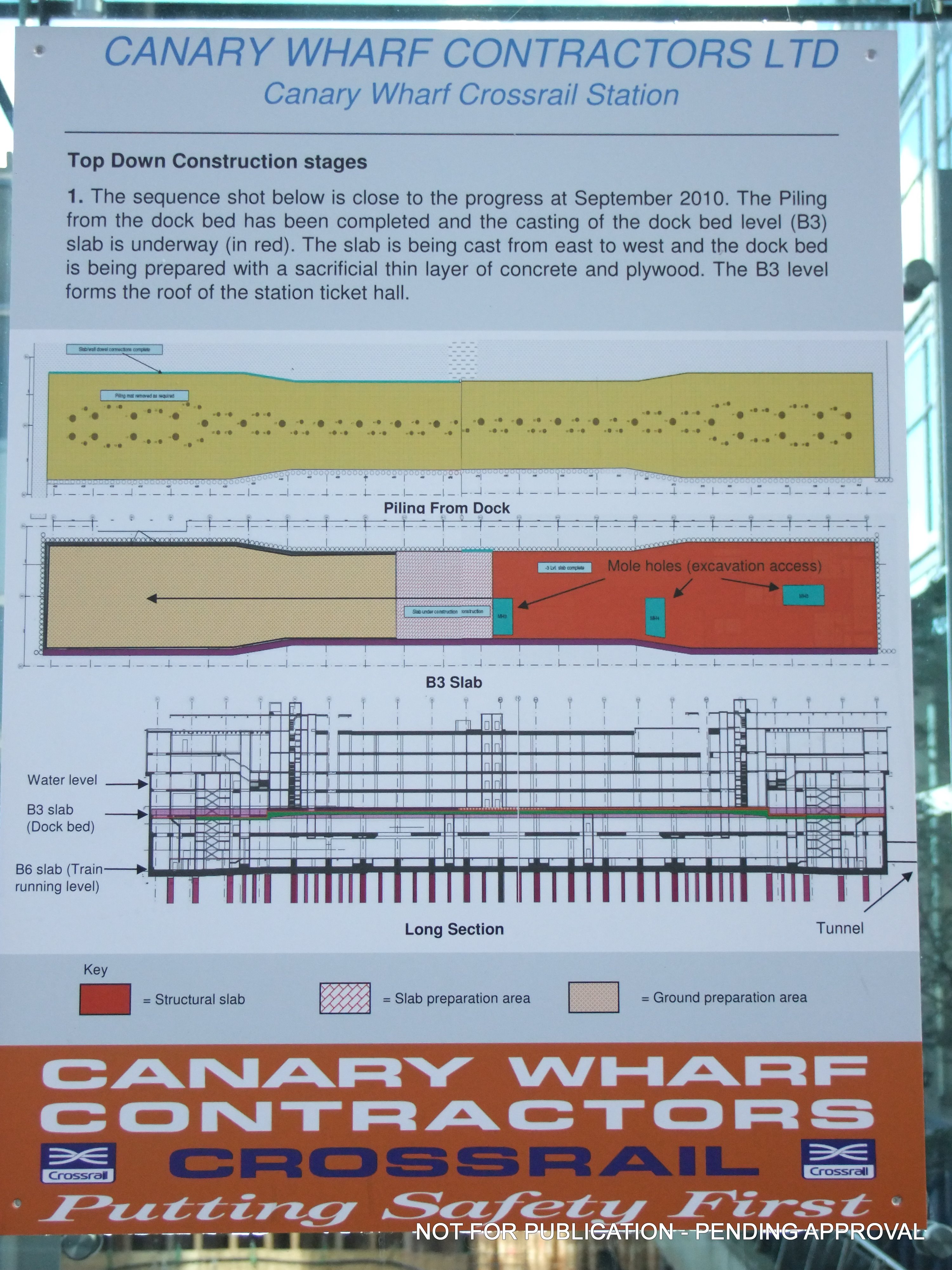This basic methodology is being used to construct the station box at Canary Wharf. The station is however being constructed in an existing water filled dock and the commencing surface is actually around the dock floor level. Significant enabling works was required by way of a watertight cofferdam formed from tubular steel piles tied back to external anchor piles. A temporary access deck above the dock and ramp down into the cofferdam provides access to the commencing surface. The illustration below – taken from a project information board – gives an indication of the stages.