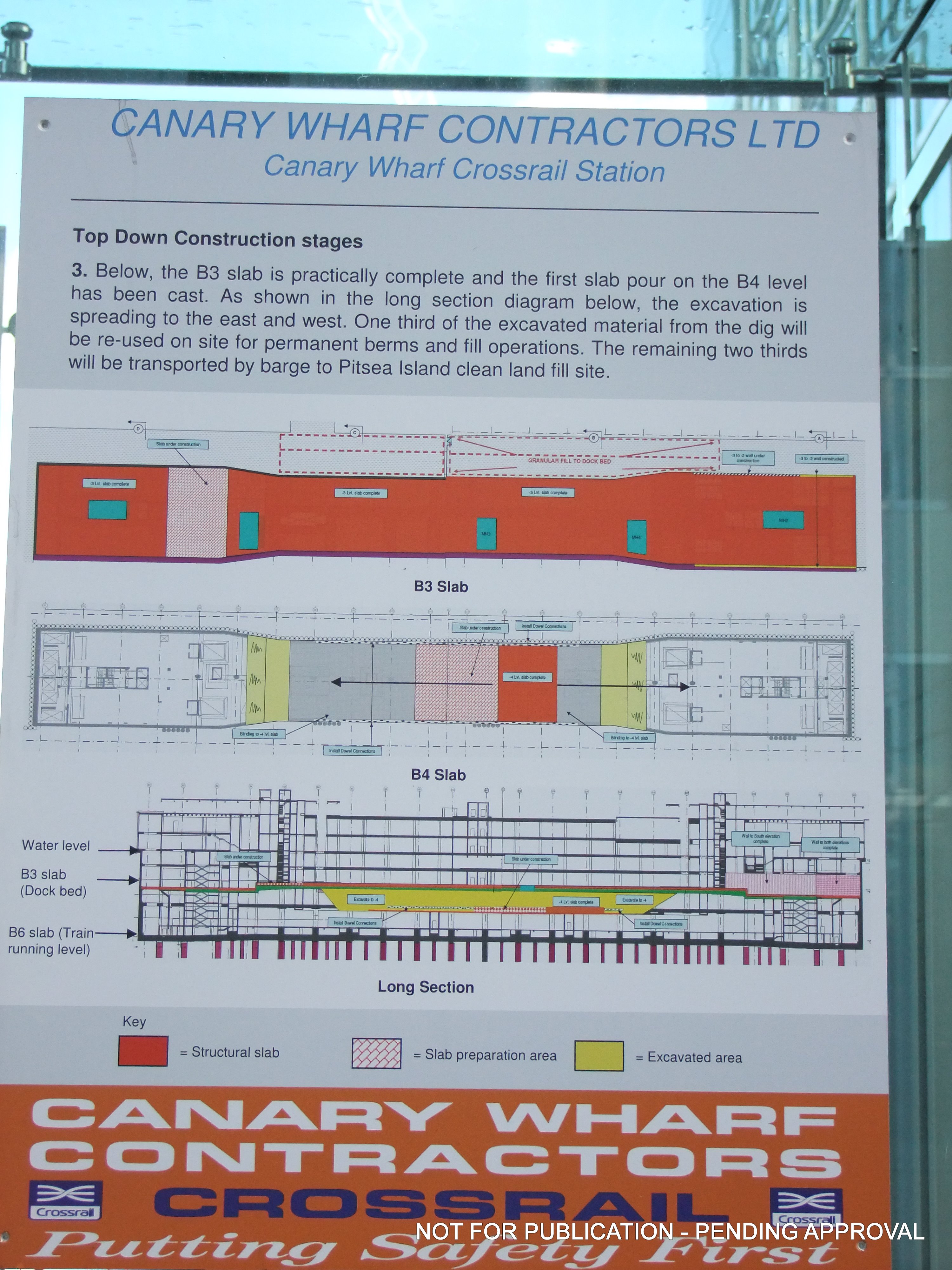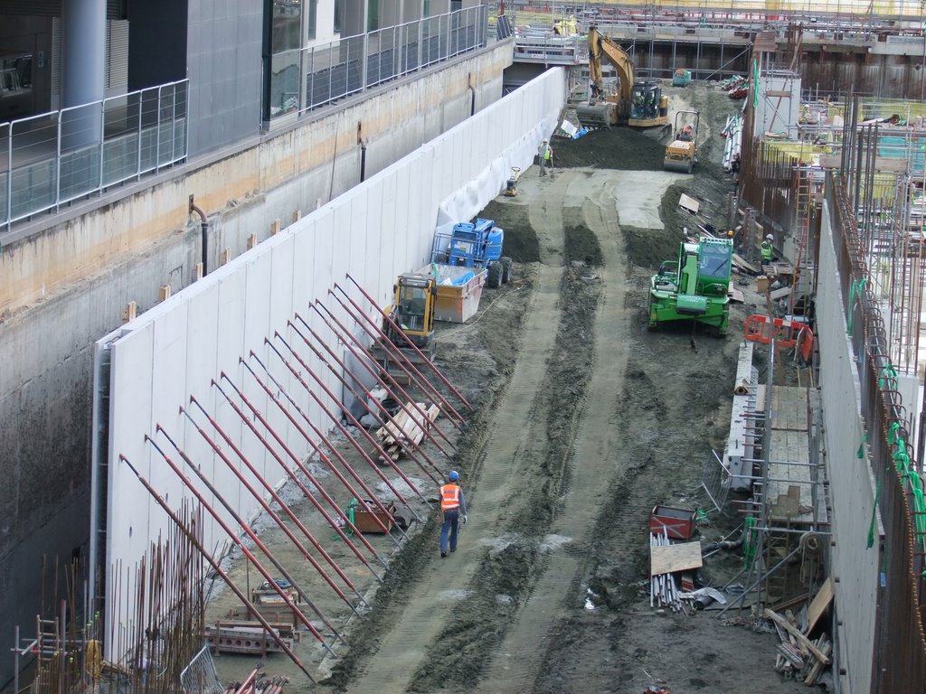 I am hopeful of getting some further facts and figures about the works that I can include as I did not note them down in the presentation. In the meantime – in broad terms – the station box is around 260m long by 25m or so wide and from B3 level to base slab dig level it looks to be about 18m deep. This equates to around 120,000m3 or circa 250,000 tonnes of sands and clays that were excavated. The B3, B4 and B6 slabs are each around 6,500m2 and assuming the base slab is 1.8m thick this equates to 11,700m3 of concrete with around 3,000T of reinforcement (at 250kg/m3) in the base slab alone.