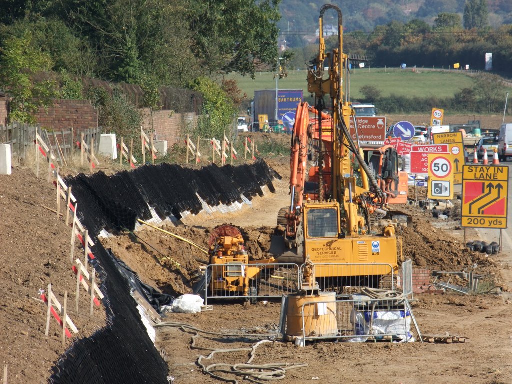 Between Church Road Bridge and the junction the road is also being widened but to facilitate this the existing cutting needs to be widened which is not quite as easy. The technique being used is call soil nailing. Essentially the ground is being dug to a slope which will not stand up (in the long term) on its own. To provide long term support a series of soil nails are put in.
