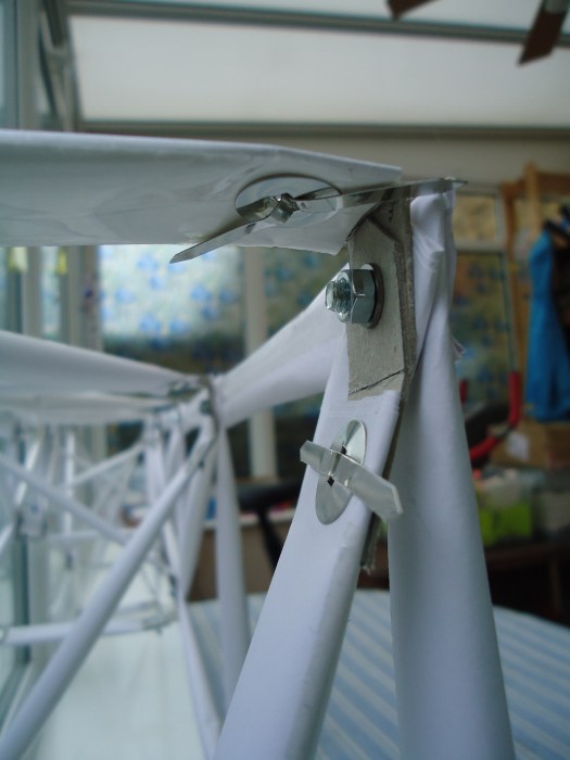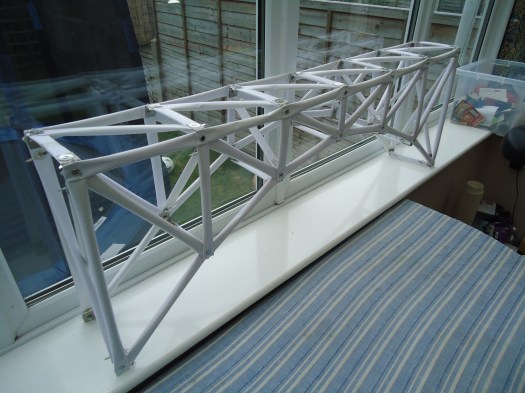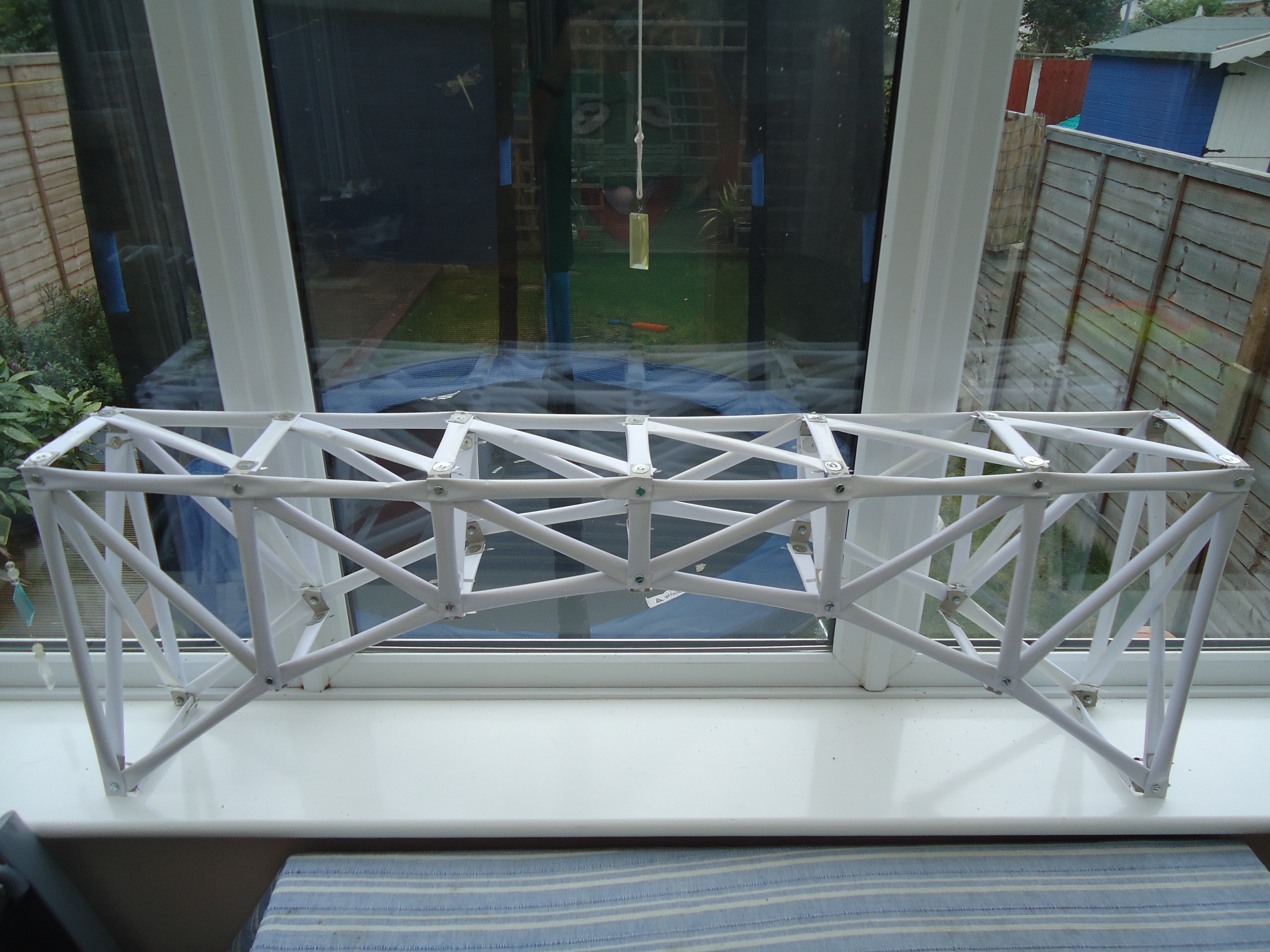 To make it more interesting I have made a paper version of the bridge above from rolled up paper sheet tubes with a combination of bolted connections and paper fastener connections. I would have used bolts throughout but they were expensive. The arch bridge is 1.2m span with height at abutments of 0.4m. It is braced in both directions on the top plate and on the verticals.