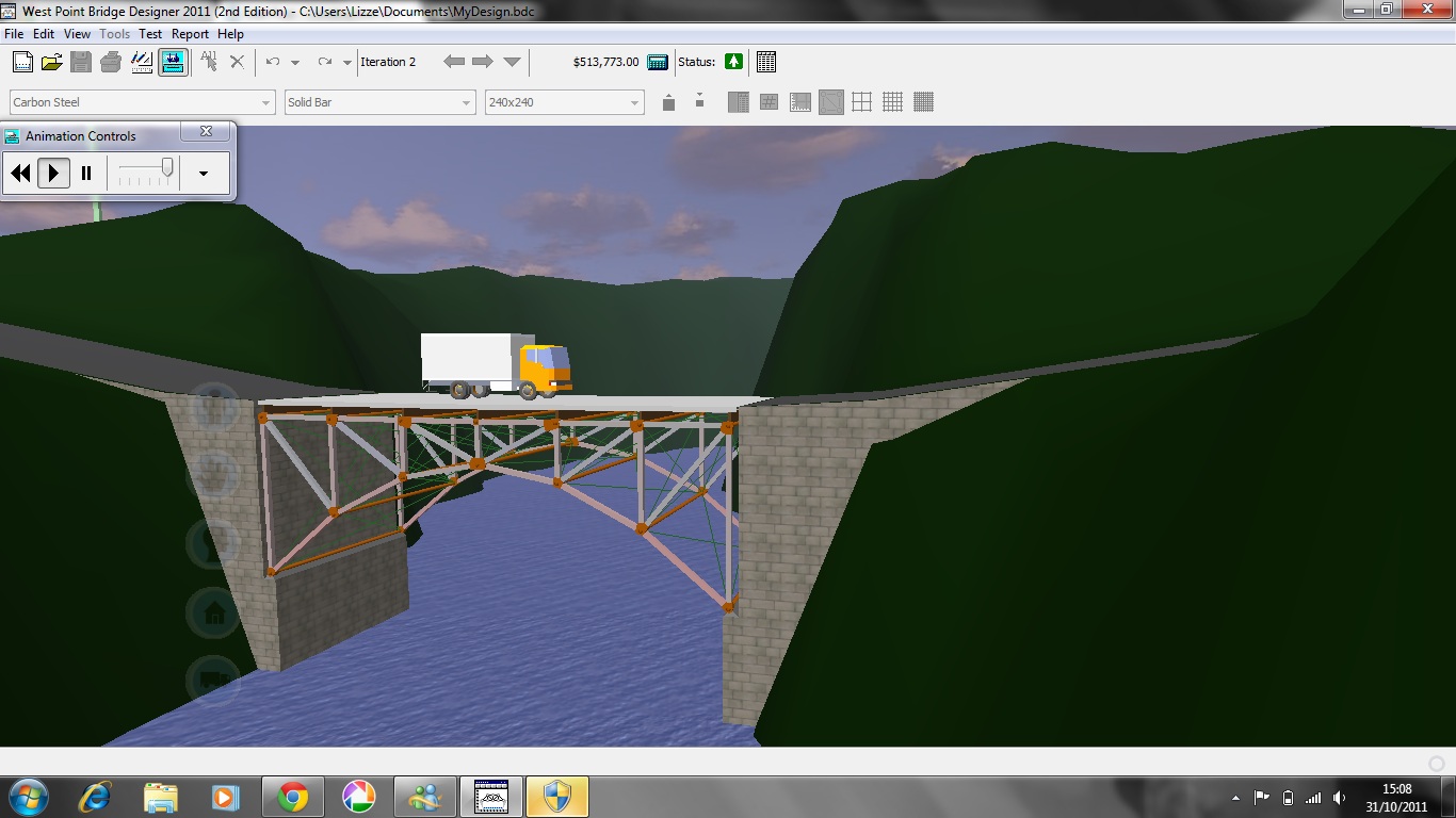 I am going to demonstrate the software quickly by designing a simple arch bridge. Screenshots below show the bridge design I will use in both design mode and in testing mode.