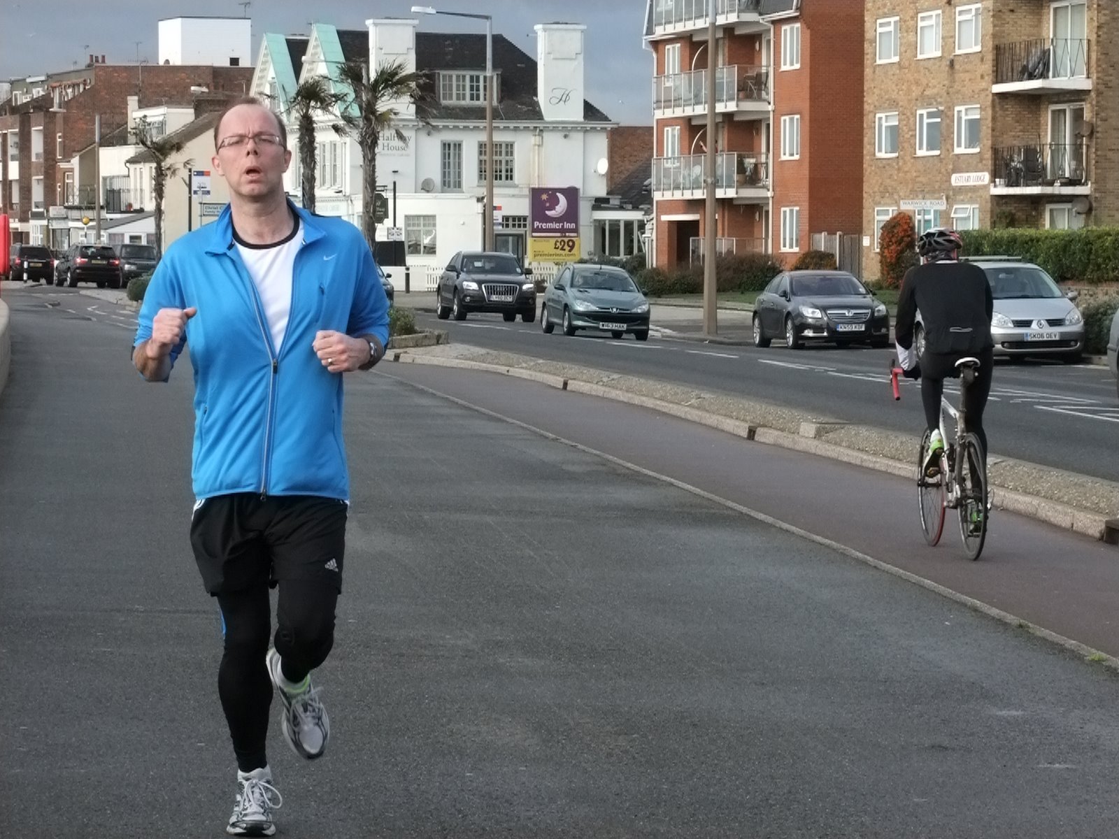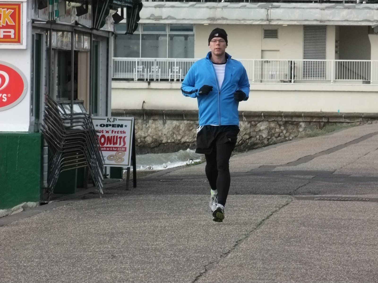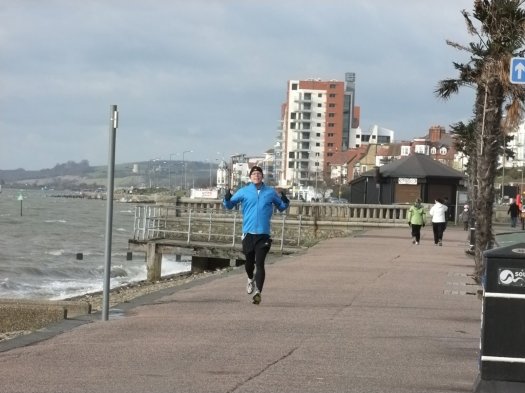 I walked/jogged down to the start to warm up and set off with the wind blowing, the sun shining and the tide and lapping on the shore of Southend seafront – all very nice. I set off at a fairly fast pace and soon got into a steady rhythm (no technical gadgetry helping – just the wristwatch). There were loads of people out running and cycling and I’m just glad I wasn’t running the other way looking at the faces of those running and cycling into the 18mph wind.