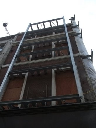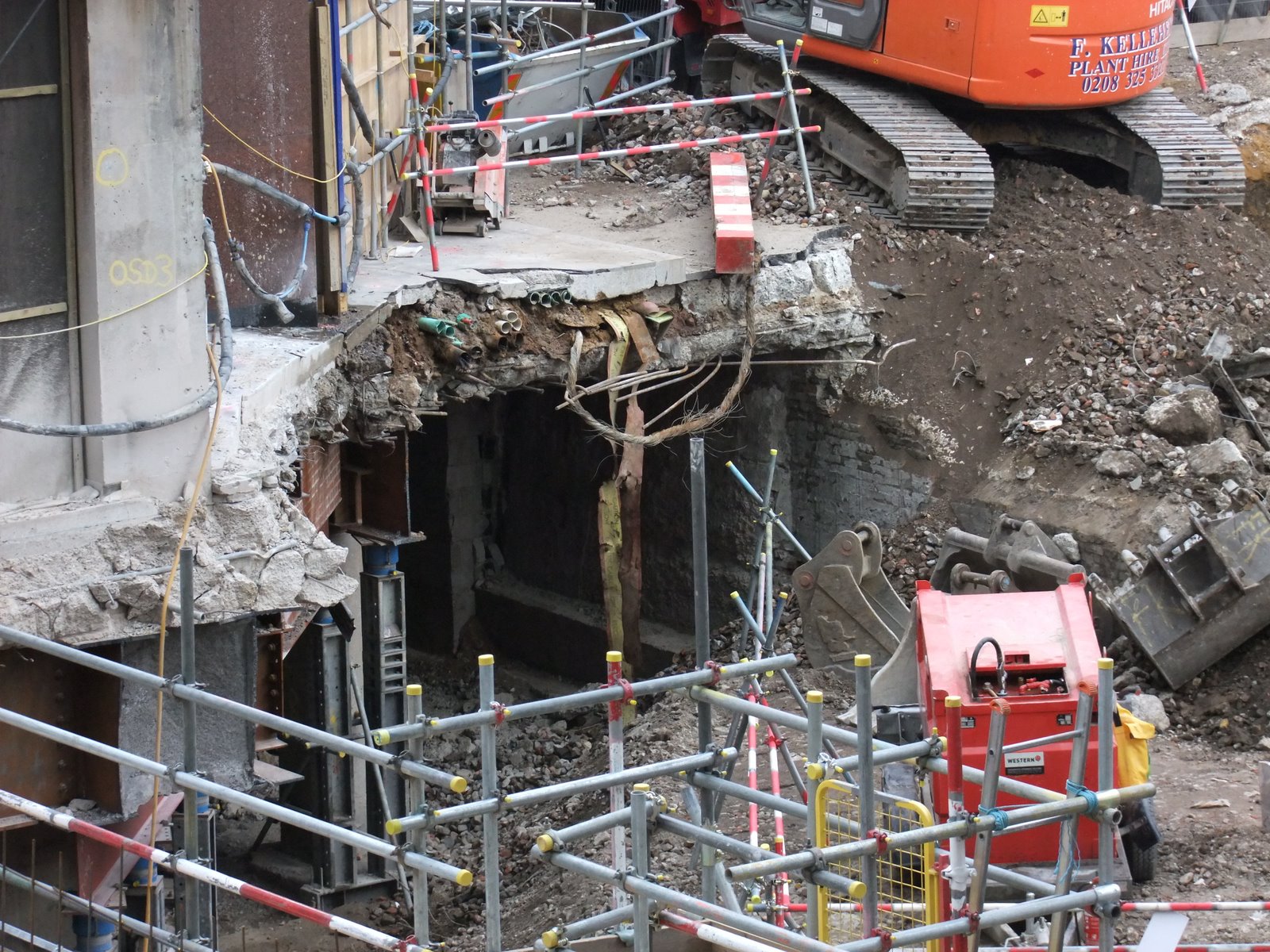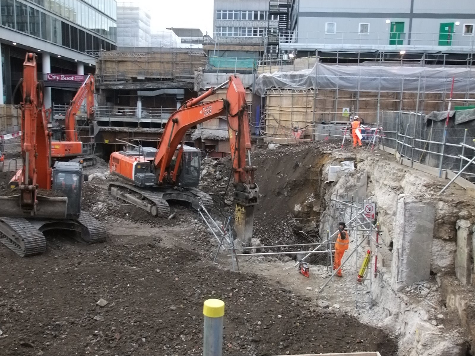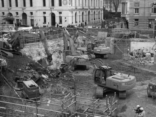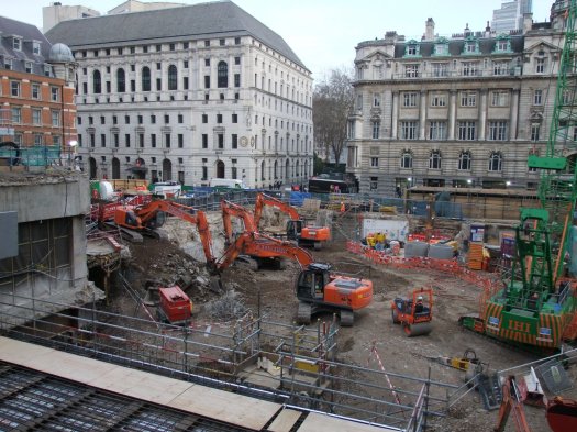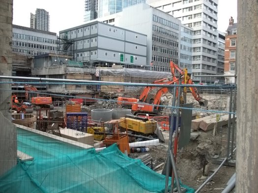 As far as progress goes they appear to have got their site accommodation block completed up where the building that was above the tube station used to be and the temporary support to the listed and other buildings looks to be complete. Focus now appears to be on removing the last of the existing basement and foundations of the demolished building in the main site area in preparation for the diaphragm walling which will form the outside walls of the shaft.