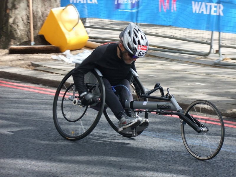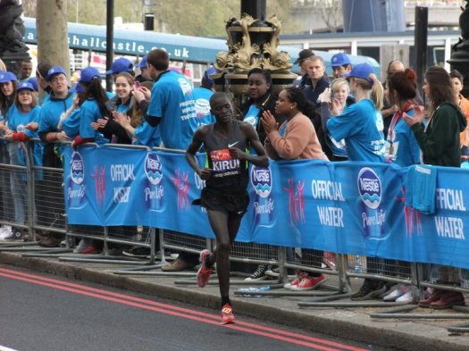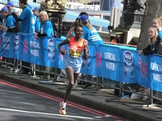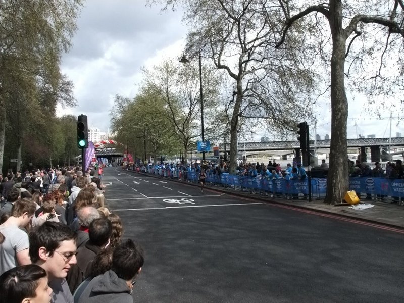 We pitched camp at about 25.5miles on the Embankment on the right hand side at the traffic lights at junction of Horse Guards Avenue which was a great vantage point. Not long after we arrived the first of the elite athletes came by.