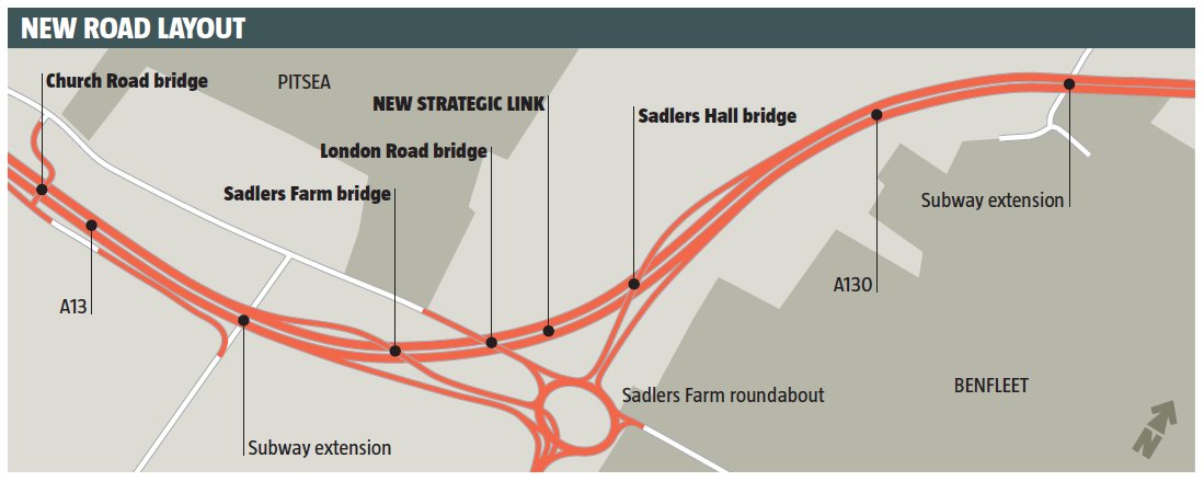 The bypass is joining the A13 to the A130 which leads onto the A127. This is pointless as there are other routes to reach the A127 which don’t require you to go near sadlers farm.