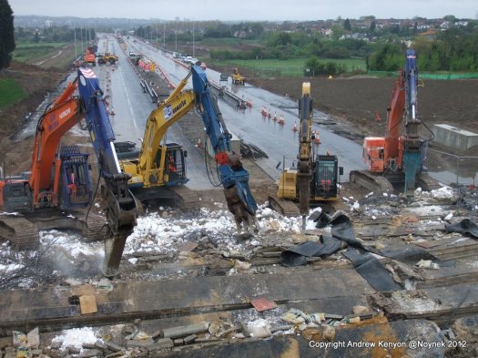 This was an opportunity not to be missed if – like me – you are a civil engineer and a photographer.  The old Church Road Bridge over the A13 between Sadlers Farm Junction and the Pitsea Flyover was being demolished todayas part of the junction improvement works.  The highway that it crosses is being widened and the bridge was too small so a new bridge has been built – and is now open – and the old one removed.