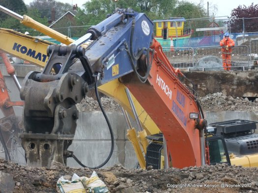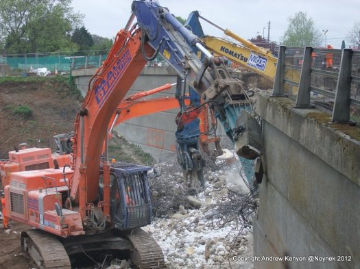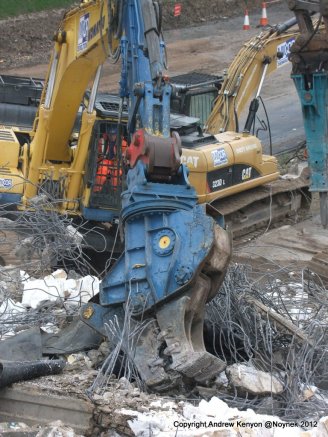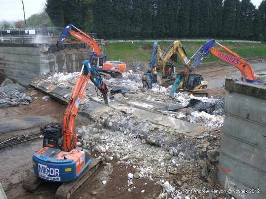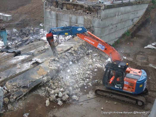 Once on the floor the deck beams and slab were at the mercy of half a dozen excavators with various tools including breakers and crushers (munchers) that were and continue to pulverise the concrete into small pieces for disposal off site. Before I left a number of the machines had started attacking the south abutment too.  I expect the whole bridge will be down and out by the end of the day.