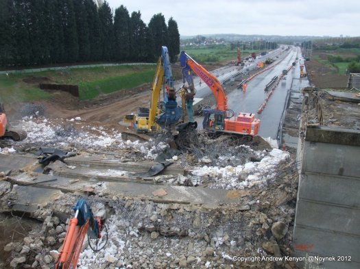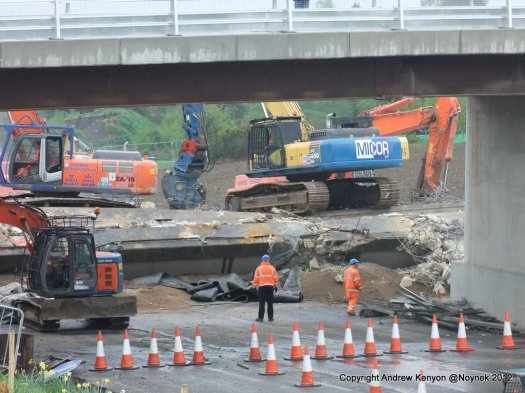 I cycled there through wind and rain and was very wet and cold when I arrived at around 9.45am.  The A13 had only been closed since 5.00am but the demolition was already well advanced.  A protective mat of granular material had been spread over the carriageway beneath the old bridge and the deck had been ‘dropped’ onto this mat by some means (not sure how) such as expanding agent or explosives or similar.