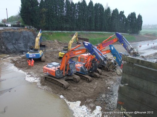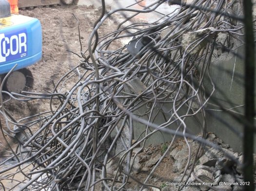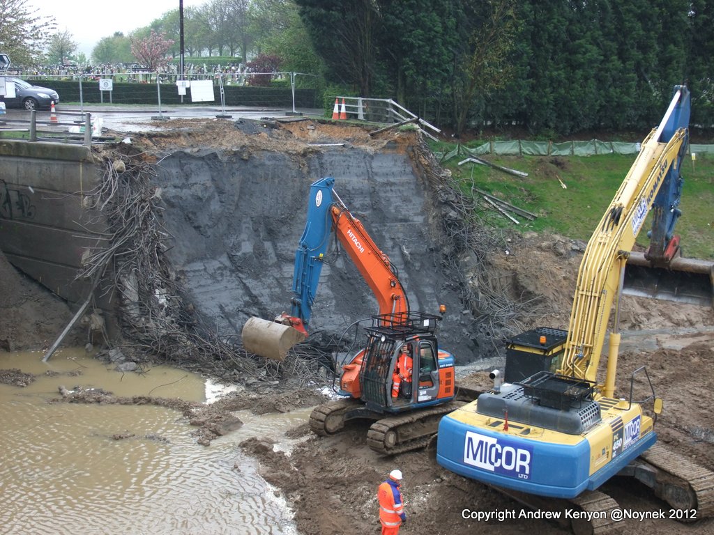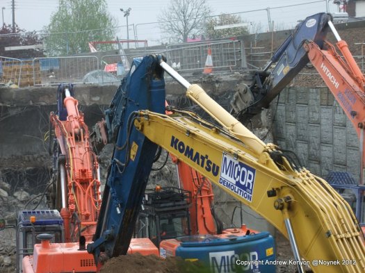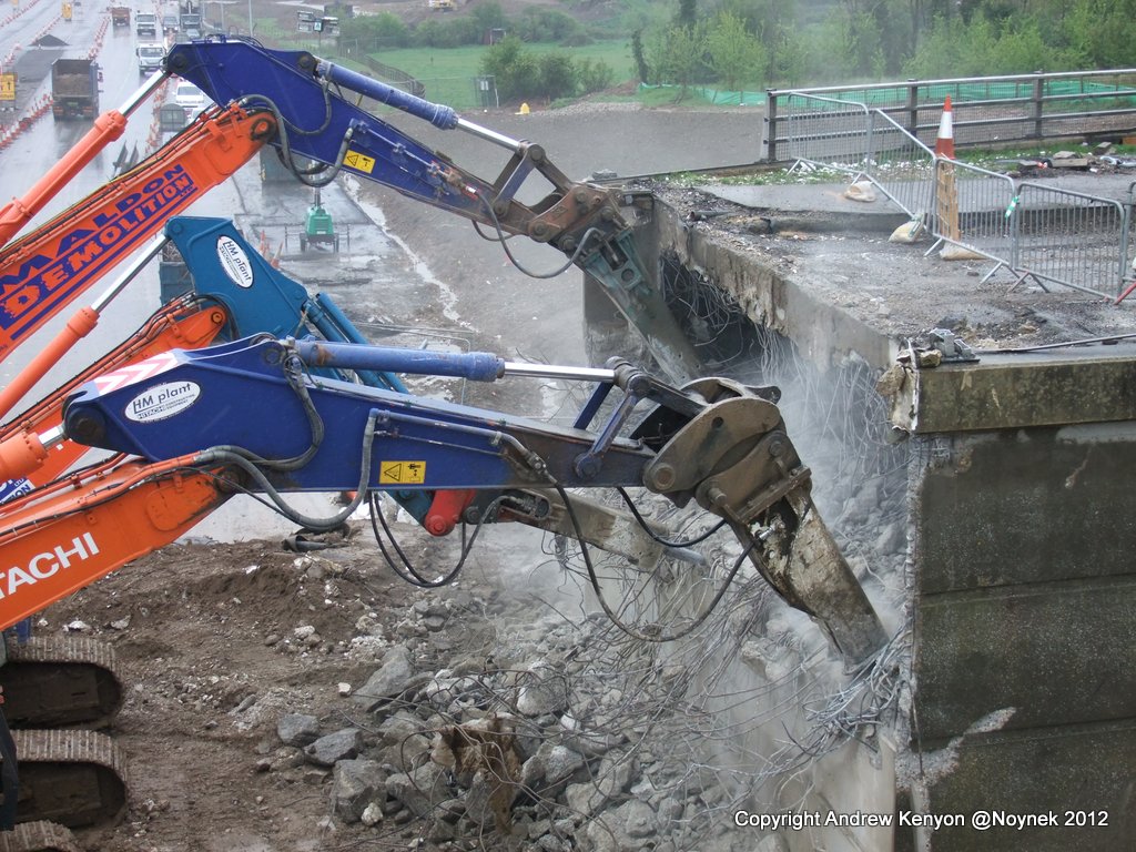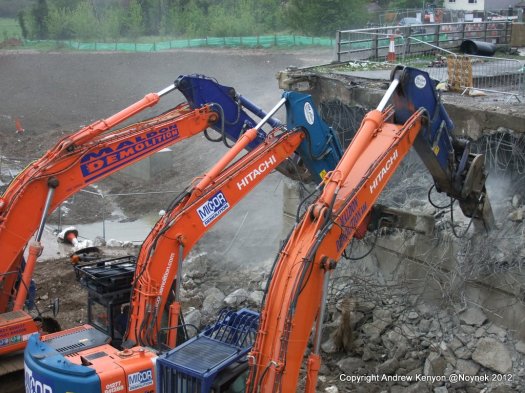All the debris from the bridge deck has gone as has that from demolition of the south abutment. Some of the south abutment remains in place but I guess that is deliberate. The breakers are now working on the north abutment. I’m guessing the concrete is very hard.