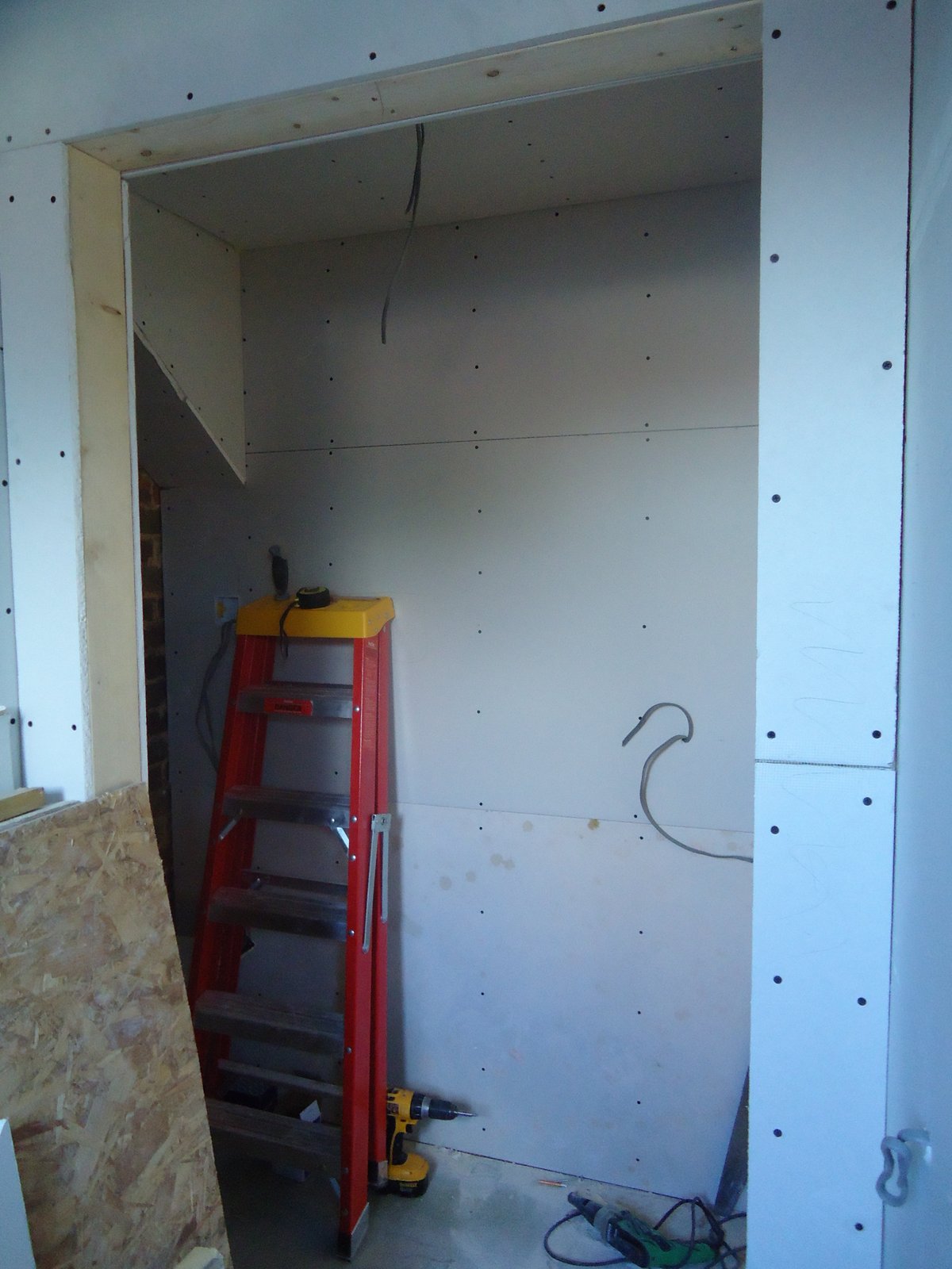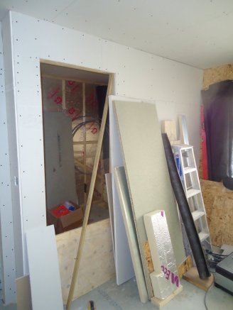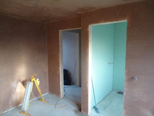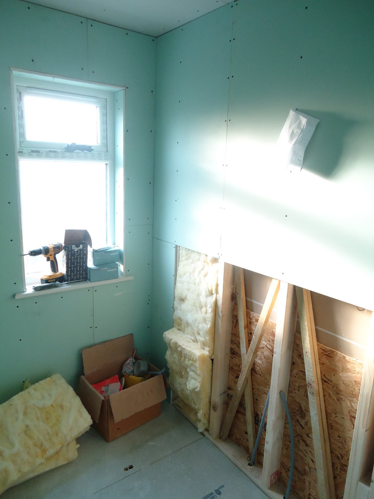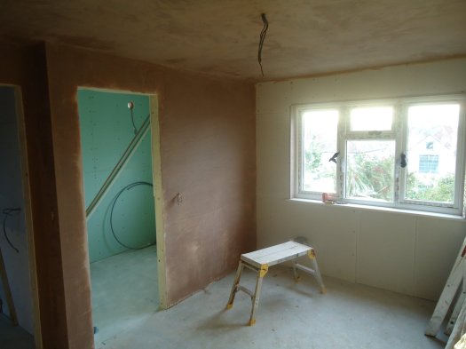 Early in the week the boys started fixing the hardiplank boards to the outside but paused I guess until the windows went in. Friday saw the back bedroom get skim plaster to one wall and the ceiling and the remaining plasterboard to the bathroom.
