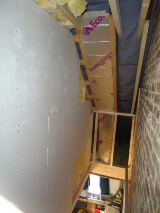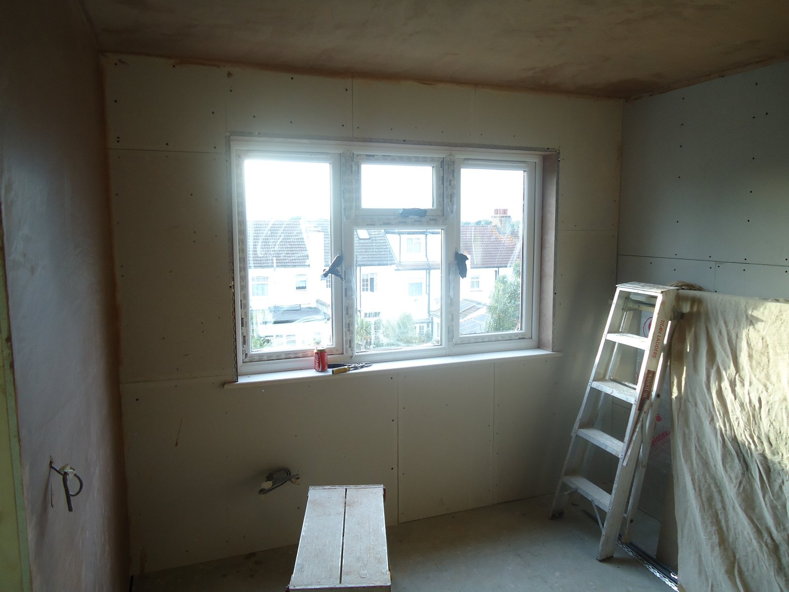 The week saw most of the remaining plasterboard going up with the only areas remaining to be boarded being the around the new staircase. The front bedroom has been almost fully skim plastered and looks great. The windows came and were fitted on Thursday to the master bedroom and the bathroom which brings light and watertightness to the back of the house.