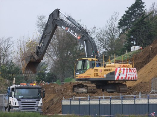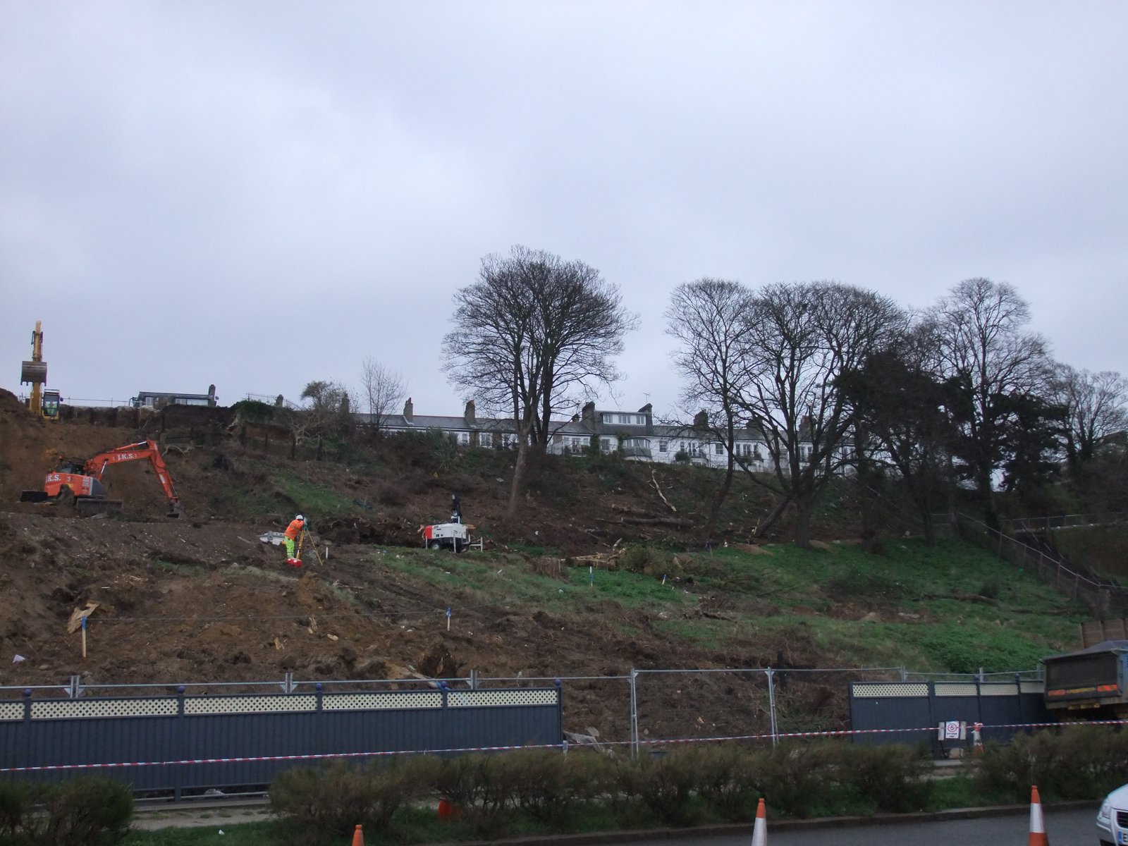 I had a good look around the works from the top and then the bottom. A contiguous pile wall has been installed along the top of the site (a line of concrete piles next to each other) which I assume is partly holding up the ground behind it and partly cutting through historical slip planes in the clay. A major earth moving operation is now underway to excavate and remove the failed ground. I believe a second contiguous pile wall will be installed along the foot of the slope and then the area backfilled / regraded with better material.