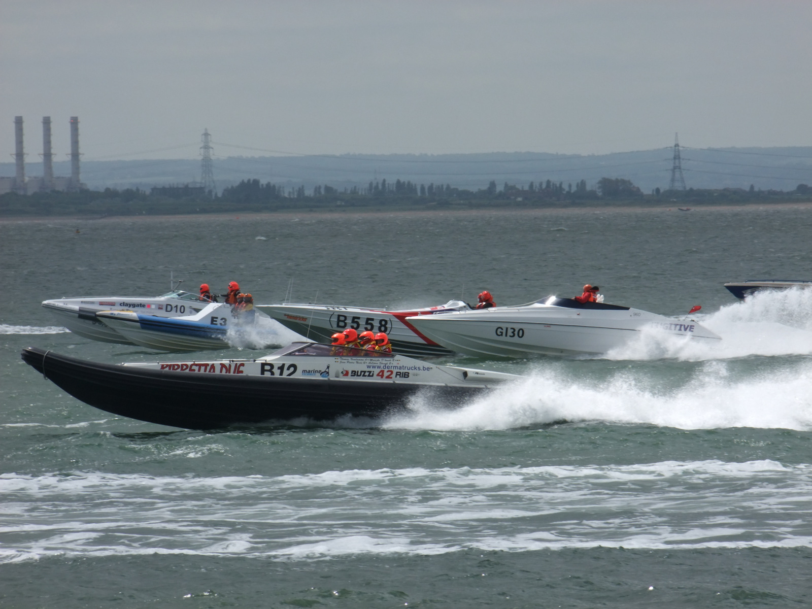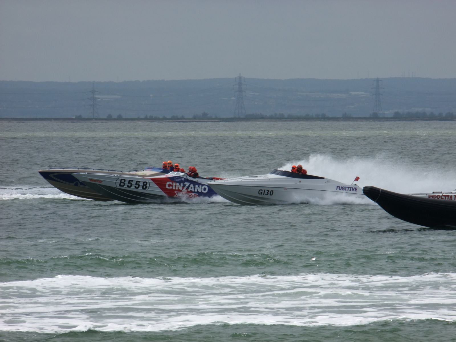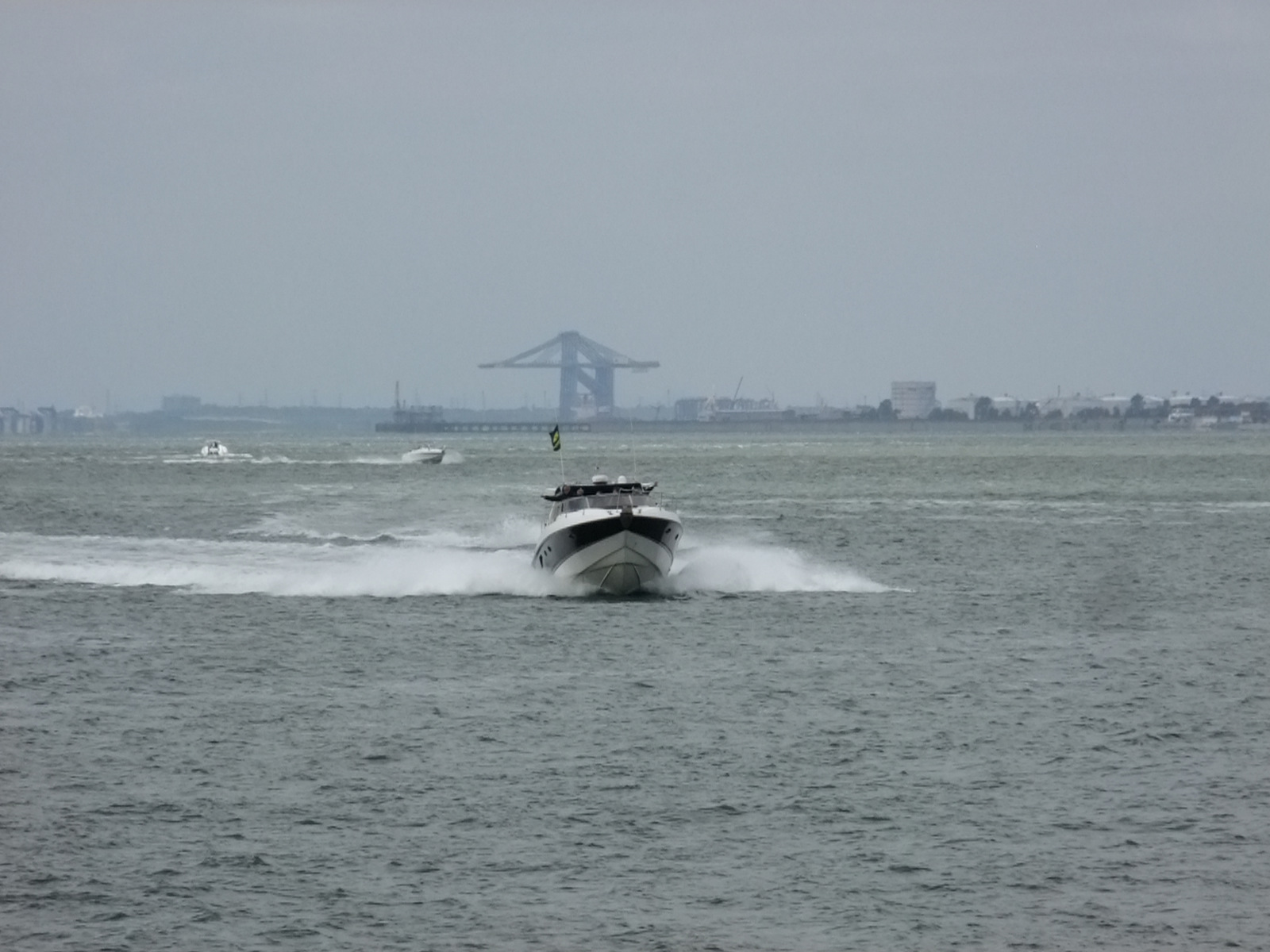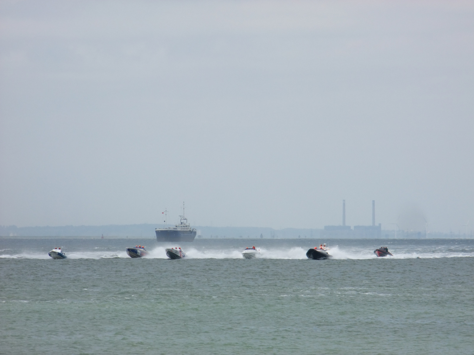 Around 11am boats were seen on the horizon but it turned out to be a number of motor cruisers that had probably been at the start down by Tower Bridge. There was some excitement when a strange tug type craft approached and then moored up against the pier but it wasn’t until noon or so that a line of powerboats were seen approaching. Apparently they had spent a fair while re-grouping off Canvey and maybe their sail-by had been choreographed for noon.