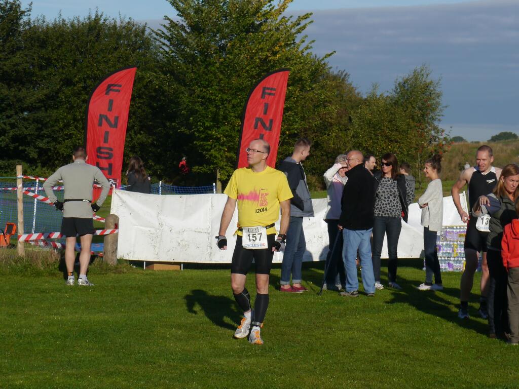 My watch did at least serve to tell me the overall time which suggested I might be able to make it back in under 1:20 but then 1:19 flicked over and this seemed to evaporate.  I did manage to semi sprint the last 100m or so and the support at the finish was brilliant.  I crossed the line in 1:20:09 by my watch and was greeted and cheered in by Ian and David and Davids family.  A mini-David brought me a bottle of water over which was brilliant.  My final run was slow even for me. 21:27 rank 94. 4 minutes slower than the first run. hey-ho.