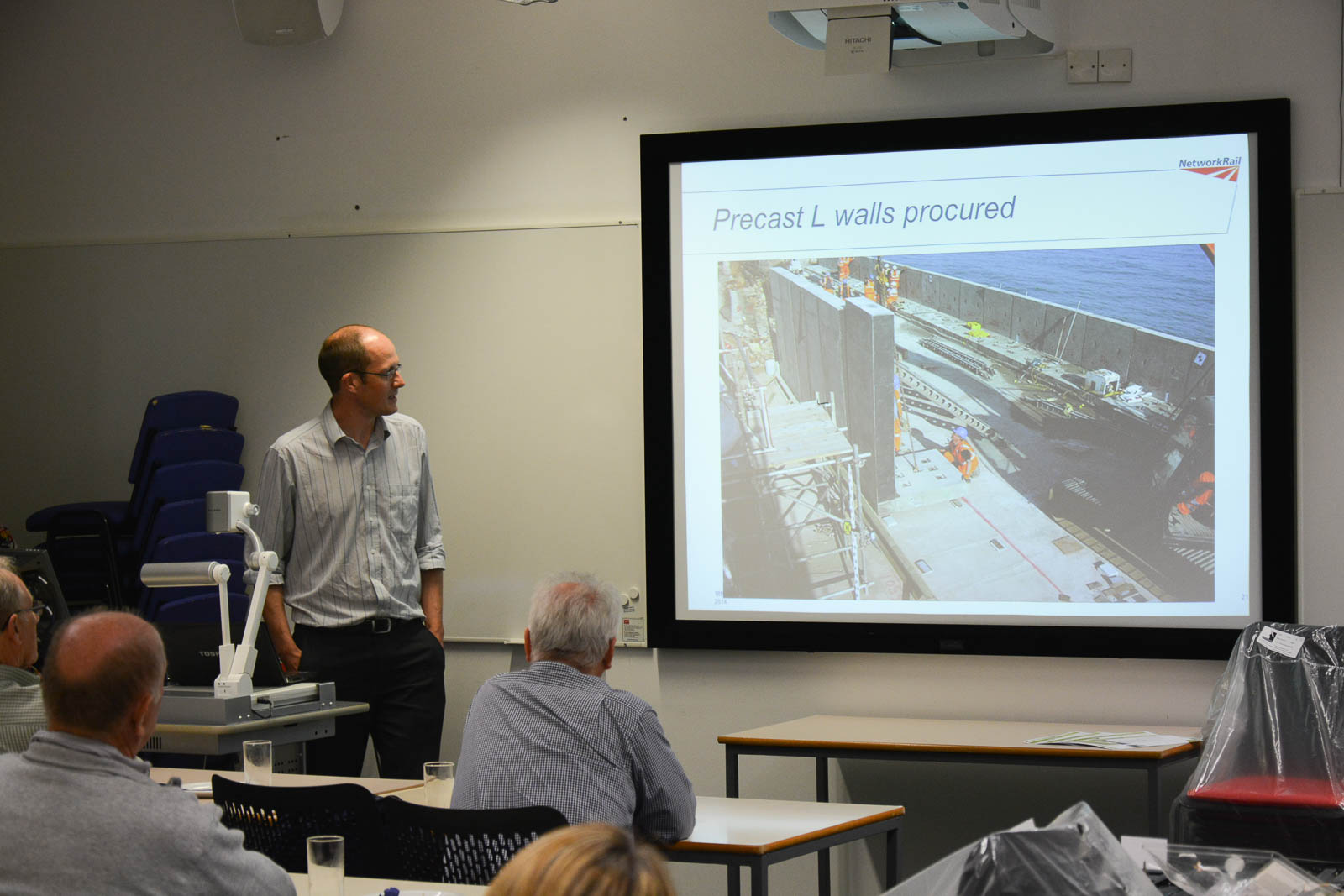 Emma kicked off the lecture and described the damage caused to the the railway and its surroundings. She described the challenges Network Rail faced – including re-opening the railway as soon as possible, working safely, ensuring the repairs didn’t get washed away whilst being carried out plus many more. She went on to describe not only the major risks in the design and construction but also some of the opportunities.