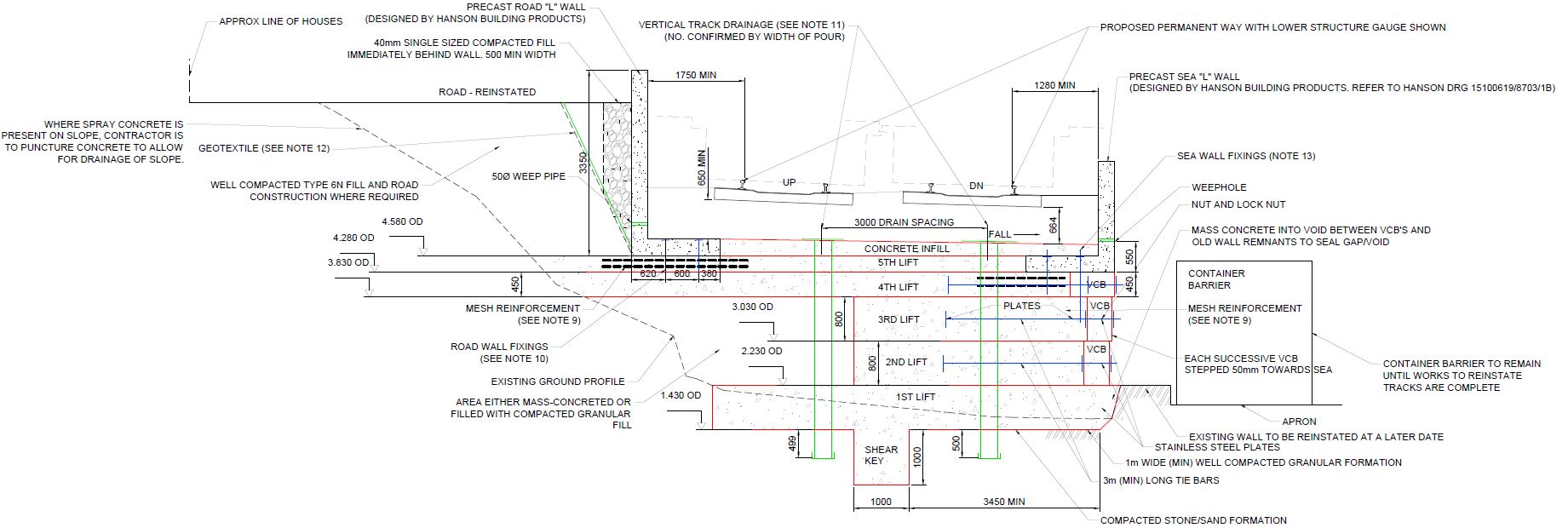 The major part of the works was the repair of the 350 metre long section where the sea wall had collapsed and the railway formation had been washed away. Jon described the solution as shown in the section below Click to open larger version in new window.