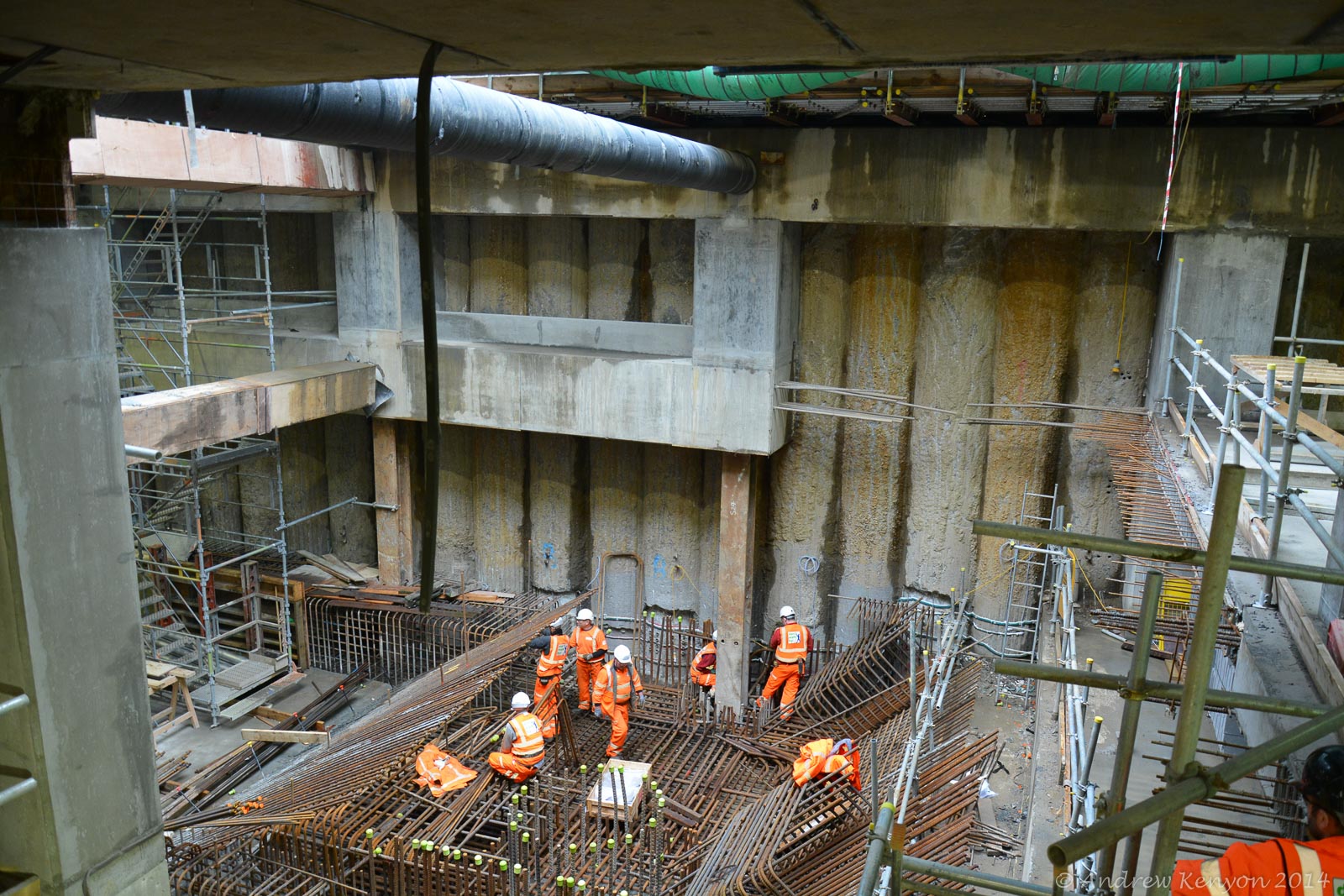 Much of the current work is centred around the new Northern Ticket Hall. The structure is/was being constructed top down with the roof slab supported on temporary ‘plunge columns’ embedded in large concrete piles. This means that even though the traffic is running in Bressenden Place supported by the roof slab the civils guys on site are only now finishing off the bottom level slab.