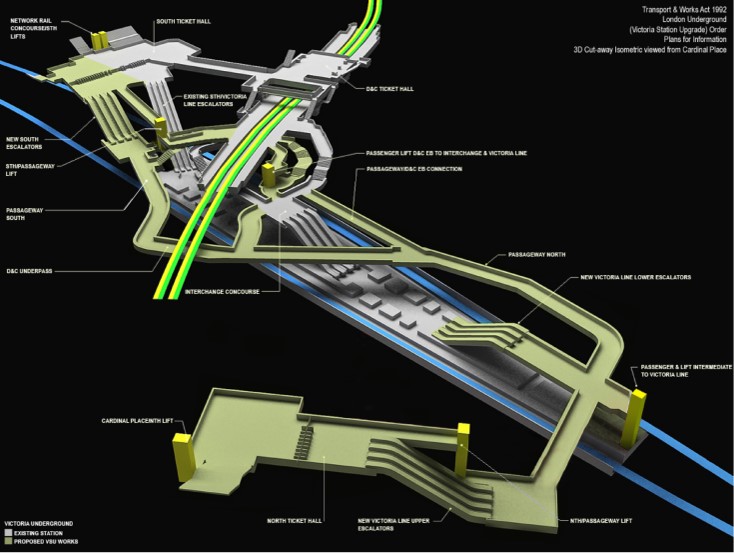 The works are basically to reduce the congestion at Victoria Underground Station which is one of the busiest and most congested on the network. This being done by enlarging the existing Southern Ticket Hall just outside the Network Rail station, constructing a new Northern Ticket Hall beneath Bressenden Place, and constructing a network of new passageways, escalators and lifts to connect it all together.
