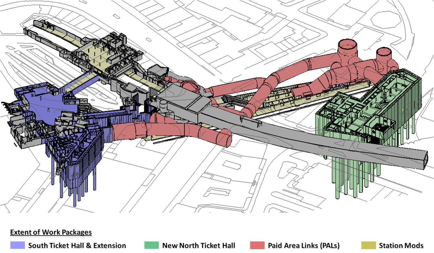 The works are progressing really well and much of the heavy civil engineering work is nearing completion. The South Ticket Hall Extension is structurally complete and building and fit-out has commenced. Tunnelling work has also started to form the escalator decline down to the new main passenger access link.
