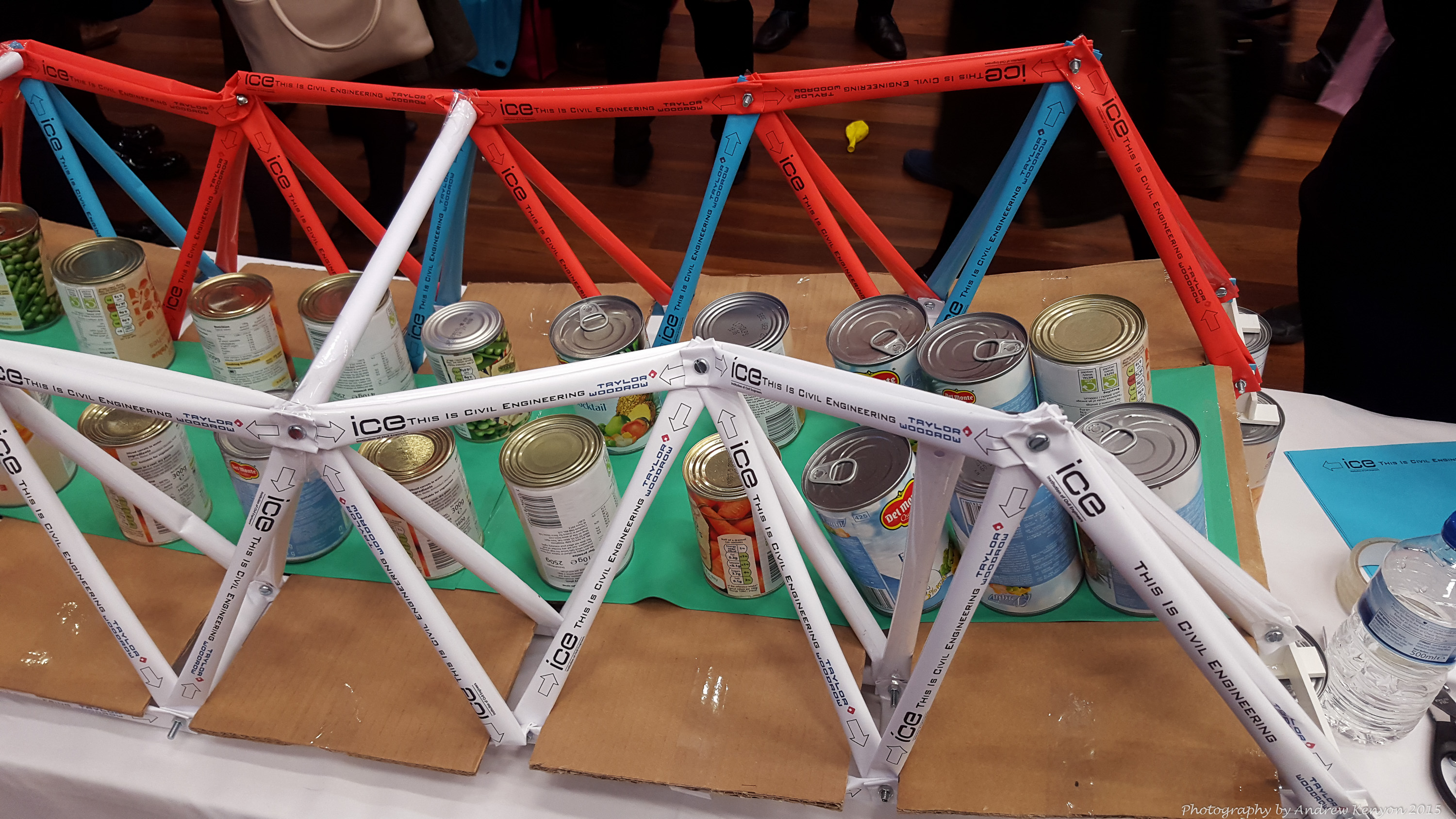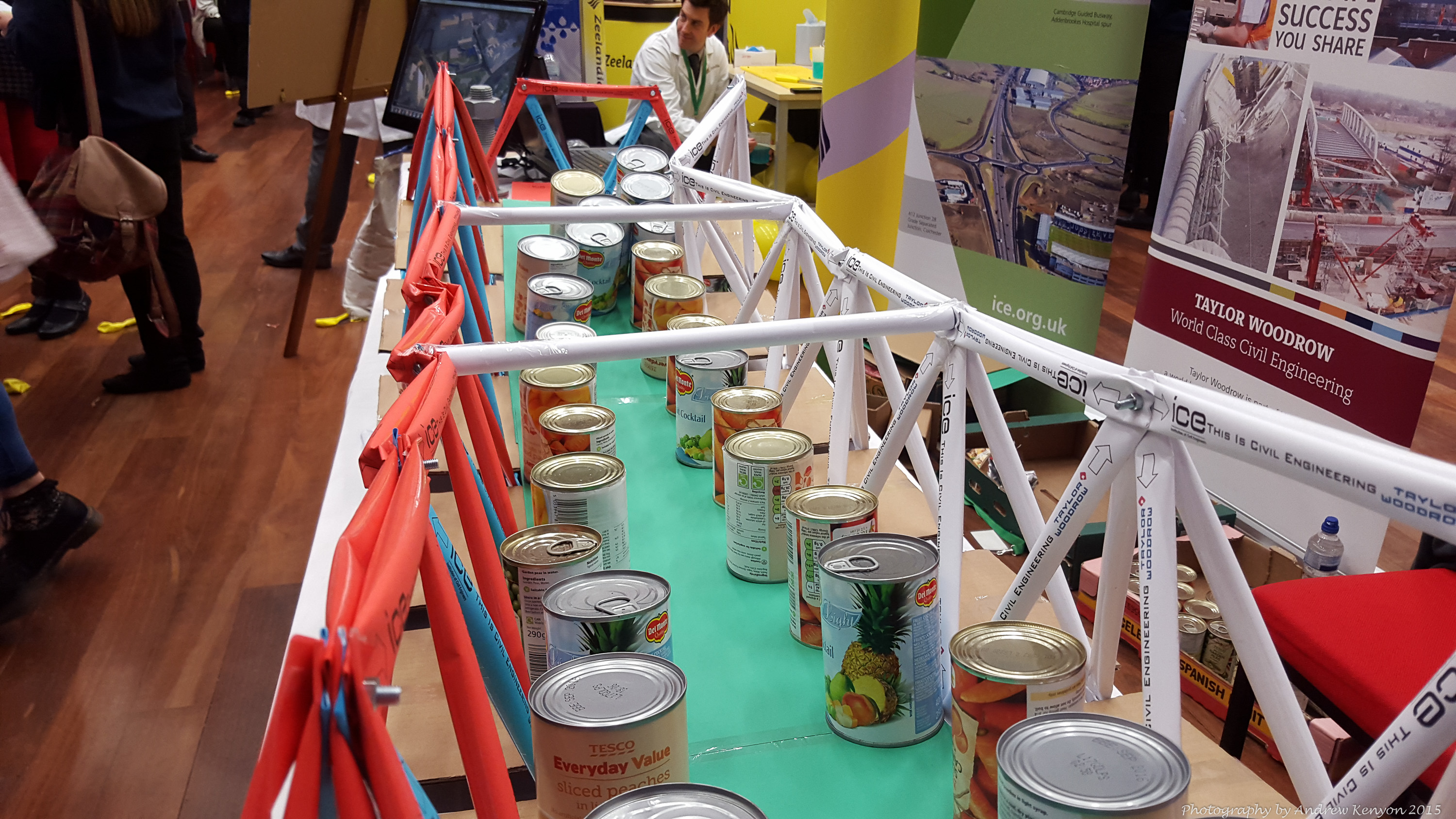 I managed to finish the bridge with a little help from some of the students in the last schools session of the day and (without checking it over) we set up for load testing it. This we were doing with tins of fruit and veg which we had brought for the purpose of (60 of them). The tins were paid for by Taylor Woodrow and will go to a food bank afterwards.