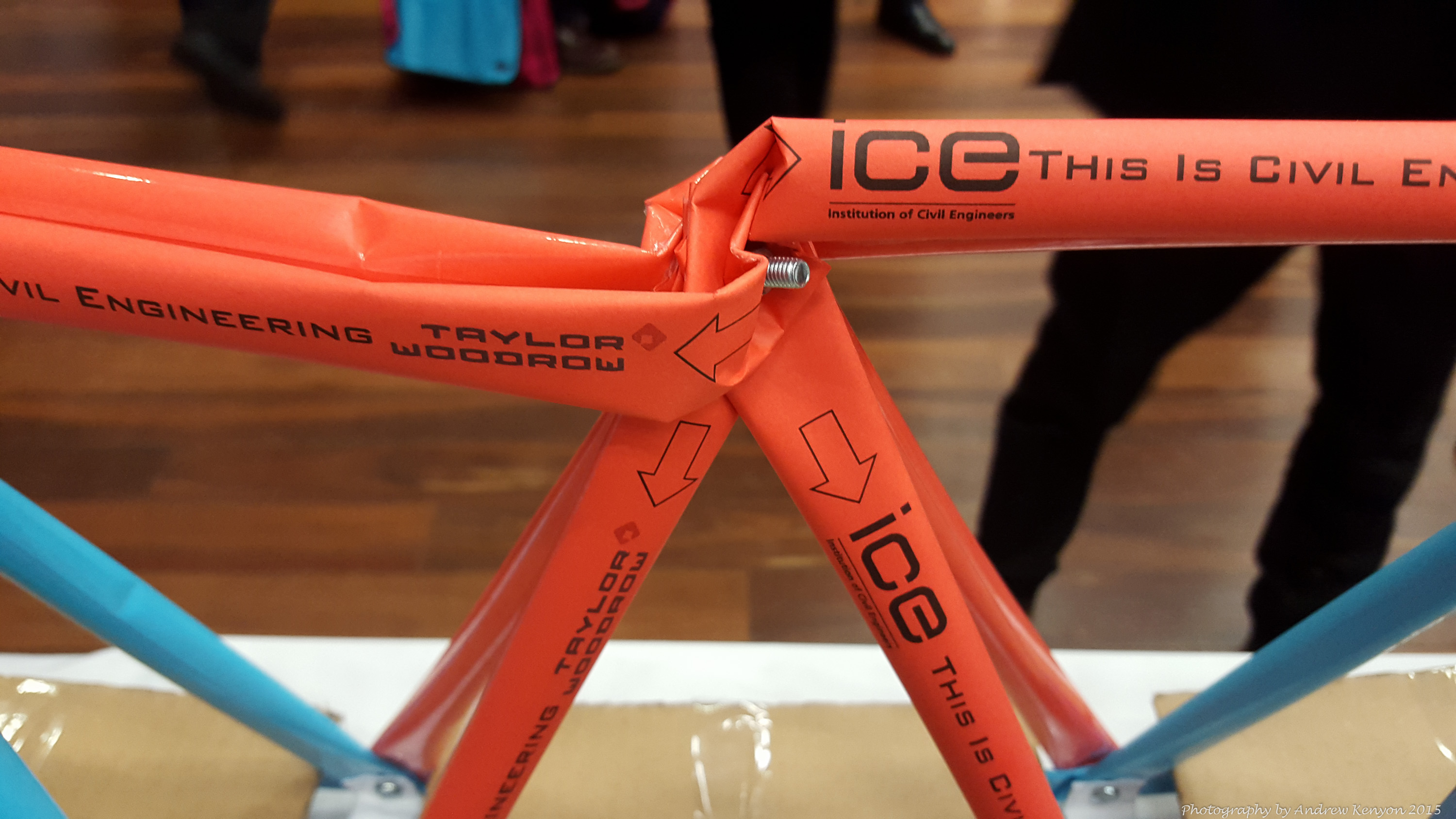 While talking to the students and drinking and trying to eat I tried desperately to assemble the paper bridge in time which included having to make some of the members. The bridge consisted of two tubular trusses about 2m long made with tubes of rolled up A4 paper with cardboard ‘deck plates’ between them. The tubes were connected with 5mm bolts and were colour coded (on one truss) red for compression members and blue for tension (hope I got them all correct!).