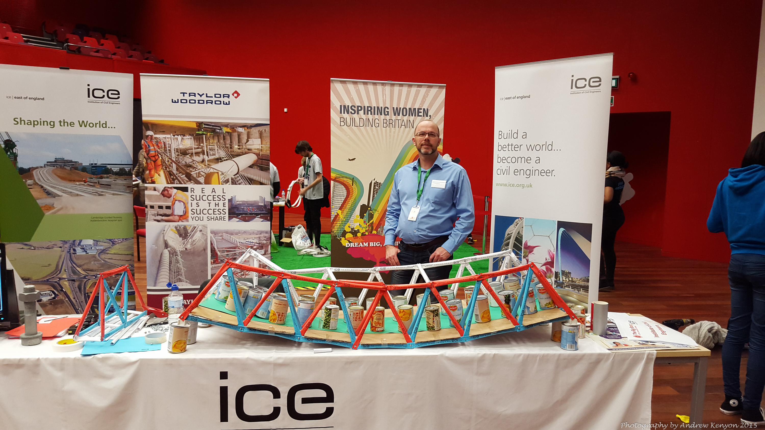 I was to be sharing the work on the ICE stand with two other civil engineers – Glen Owen who is the Regional Director of ICE East of England region and Michelle Nixon the ICE Essex Branch Schools Liaison Officer. Things didn’t pan out as planned however as Michelle was only able to be there for a couple of hours due to an unexpected home issue and Glen didn’t make it at all as he was struck down with a stomach bug.